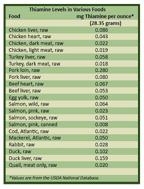 硫胺素是一種可溶於水的維他命B,在檸檬酸循環過程中,幫助身體利用來自碳水化合物的熱量。在這個製造熱量的過程中,硫胺素是一個重要的輔助因子,對於健康的神經系統以及心臟功能尤其重要.硫胺素不足會造成神經症狀、心跳不正常以及腸胃道症狀(註2)。很多食物含有硫胺素,例如穀類、蔬菜、豆類植物和酵母,動物的肌肉組織中也有,尤其是肝和心。食物中含有硫胺素,可能和活躍度或生物利用率沒有相互關聯。因為有好幾個因素,會影響加工處理過的食物中的硫胺素的活躍度和生物利用率。以下的處理方法會讓硫胺素的活躍度降低百分之50到100:加熱、含硫磺的高劑量食物防腐劑,例如二氧化硫,以及罐頭中會改變食物酸醶值的食物增稠劑(註3)。