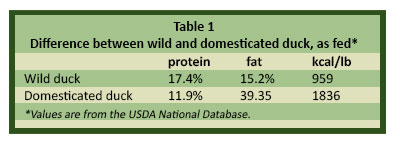 和野鴨比起來,人工養鴨的脂肪和熱量(以每磅為基準)多出2倍以上。以主要營養物質為出發點來看,這根本是兩種不一樣的動物。請注意,野生獵物的脂肪含量和種類,會受到下列因素影響而有所不同:季節、體型、性別、健康狀況、年紀、食物、掠食動物的存在與否,以及其他因素。