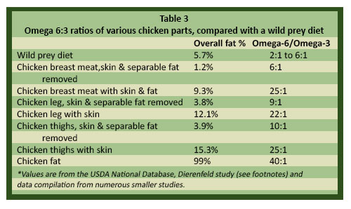 和鴨一樣,大多數的人工飼養家禽,尤其是雞,身上的脂肪都高於野生獵物。雖然家禽的飽和以及多元不飽和脂肪整體之間的平衡,比較接近野生動物,但omega6卻太高,以及omega 3不足。幾乎所有的脂肪酸專家都同意,高omega 6 + 低 omega 3,可能會造成不健康的身體狀況(註4)。人工飼養的雞,視不同部位而定,omega 6比omega 3多出6到25倍。表三比較的是雞肉不同部位和野生獵物的差別。