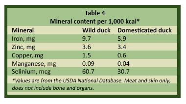 和人工飼養動物比較起來,野生獵物的礦物質含量較高。主要是因為人工飼養的動物吃的食物礦物質含量較低,不過在多數不同種的動物中,鋅是例外的。這可以藉由比較人工養鴨和野鴨的礦物質看出來,如表四。