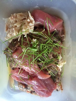 1. 除去大約一半的皮,把大部份的肉切或剪成一口可吃下的小塊,放在一旁備用,不要絞。