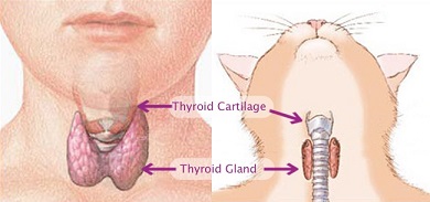 圖一:人類和貓科動物的頸部甲狀腺圖,所有的哺乳動物頸部都有一個雙葉型腺體,名稱取自與其連結的甲狀軟骨。貓體內連結兩片葉狀腺體的中央甲狀腺峽已經退化不具功能,結果是形成兩片獨立的腺體。