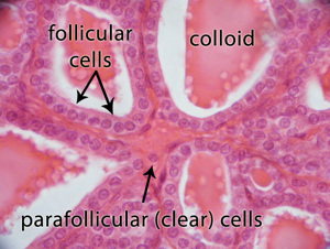譯註:colloid膠體;follicular cells濾泡細胞;parafollicular cells濾泡旁細胞