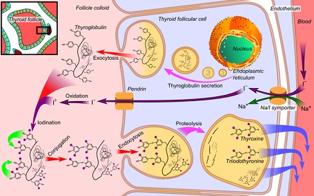 圖三:單一甲狀腺濾泡細胞製造甲狀腺荷爾蒙過程圖解。甲狀腺球蛋白在內質網被合成後,循著分泌途徑,藉由胞吐作用進入甲狀腺濾泡內腔中的膠體。同時,碘化鈉(Na/l)同向運輸器(或譯順向轉運體)把碘(I-)打入細胞內。然後這個碘藉由pendrin轉運體,以被動的方式從細胞質進入濾泡內腔。在膠體中,碘(I-)被甲狀腺過氧化酶氧化成碘(I0)。碘(I0)積極回應,在蛋白質鏈中用酪氨酸殘基碘化甲狀腺球蛋白。在接合作用之中,相鄰的酪氨酸殘基被配對。全部的複合物再次藉由內吞作用進入濾泡細胞。許多蛋白酶作用下的蛋白水解,釋放出四碘甲狀腺原氨酸 (T4) 和三碘甲狀腺原氨酸 (T3) 分子,進入血液。