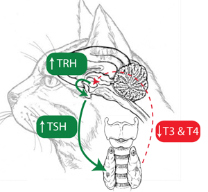 甲狀腺功能正常的病人,沒有攝取足量的碘時,甲狀腺荷爾蒙的分泌會降低。這種尚未出現臨床症狀的甲亢會刺激腦中的下視丘,提高製造甲狀腺促素釋素,簡稱甲釋素(TRH)。甲釋素刺激腦下垂體提高分泌並釋出促甲狀腺激素(TSH)。
