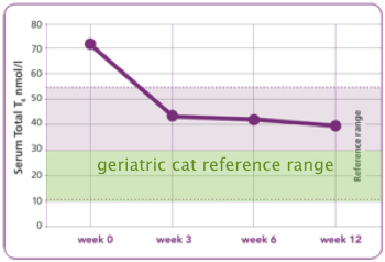According to data provided by Hill’s Pet Nutrition, about 75% of hyperthyroid cats exclusively eating y/d will have normal serum total T4 concentrations by 4 weeks on the diet. By 8 weeks, 90% of cats have a serum T4 level; by 12 weeks, almost all cats should have values within the reference range [26].