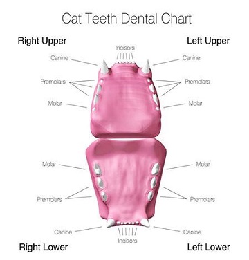 貓有兩組牙齒:乳牙和恆齒。乳牙會在貓大約二到三週大時開始長出,恆齒則是在三到四個月大時開始冒出。一隻成貓有三十顆牙齒。牙齒表面平滑,形狀依功能不同而異。根據形狀不同來分類,有門牙(incisors)-嘴巴前面的兩排牙齒;犬齒(canines )-形狀像刀子;前臼齒(premolars)和臼齒(molars)-兩邊三角形狀的牙齒。貓的上顎有六顆門牙、兩顆犬齒、六顆前臼齒和兩顆臼齒;下顎有六顆門牙、兩顆犬齒、四顆前臼齒和兩顆臼齒。