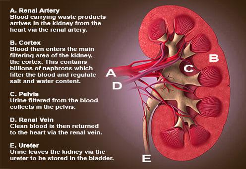 血液帶著這些廢棄物,從心臟經過腎臟動脈到達腎臟。血液在腎臟過濾後產生尿液,過濾後的乾淨血液回到心臟。