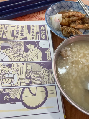 拿到第三冊那天,因為圖書館就在慈聖宮附近,想說順便去看看早已放棄的葉家肉粥有沒有開,沒想到竟然有開。開心的邊吃邊看漫畫,讀到書中畫了就在附近的迪化街。迪化街不知道去過幾百次,但畫中是1960年的迪化街,雖然那時我還沒出生,但看了好懷念。現在的迪化街一堆文青,越來越走味了。
