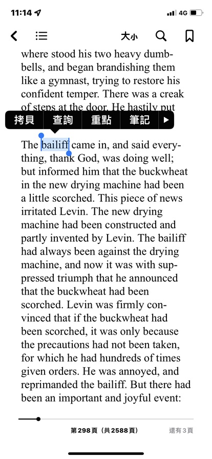 我用手機鬧鐘每天叫我起床;用天氣app看這一週要怎麼穿衣服,尤其是最近這種多變的氣候;每天搭公車都要玩一下寶可夢,但最近玩的時間越來越少,因為開始用手機讀電子書;每天都需要用手機處理工作的事;一週有好多次要用手機的網銀轉帳;每天等公車都要用公車app看還要等多久;幾乎每天都要用市圖的app查我預約的書到了沒有,或是哪天需要去還書;常常用網路查資料,例如昨天查了蘇俄作家托爾斯泰的生平還有印度的歷史;自從發現手機有內建的免費電子書可以看,坐公車的時候開始讀電子書,最近在讀的是安娜卡列妮娜。電子書最大的好處是遇到不懂的生字時,只要按住那個字,就可以查單字,例如照片一,超好用。每天睡覺前讀兩小時的書,都會開youtube聽音樂。一邊讀小說一邊喝酒一邊吃下酒菜一邊聽音樂,人生好滿足。