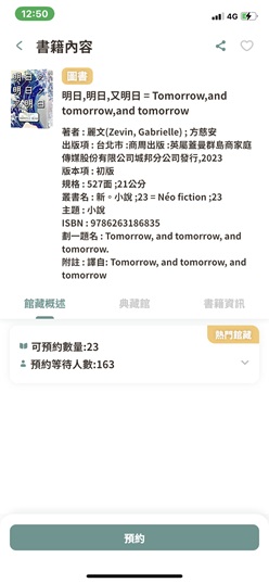 市圖這本小說英文版 (Tomorrow, and Tomorrow, and Tomorrow by Gabrielle Zevin)有24本,目前有12本被借出,包括我借的那本(很爽的精裝本),所以預約英文版不用等。中文版也是24本,目前有一百六十幾個人在排隊,如照片,大概要排到地老天荒了。
